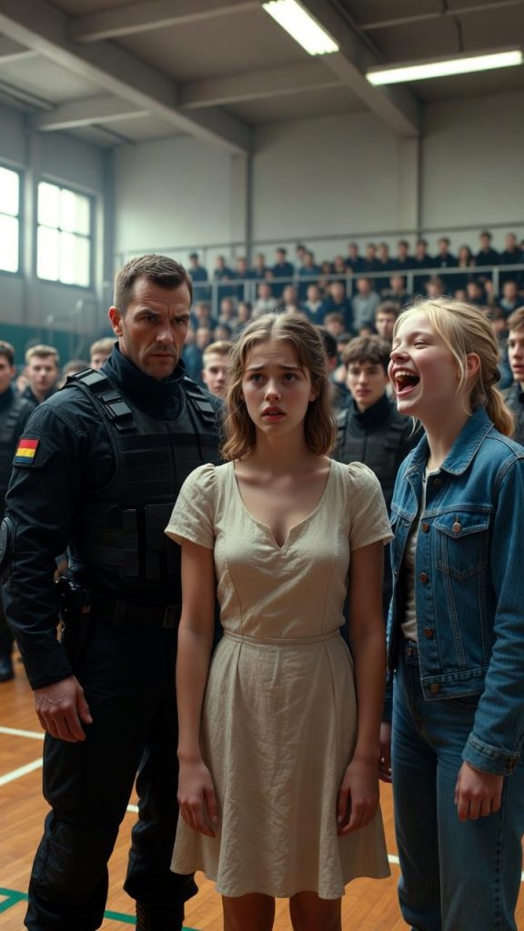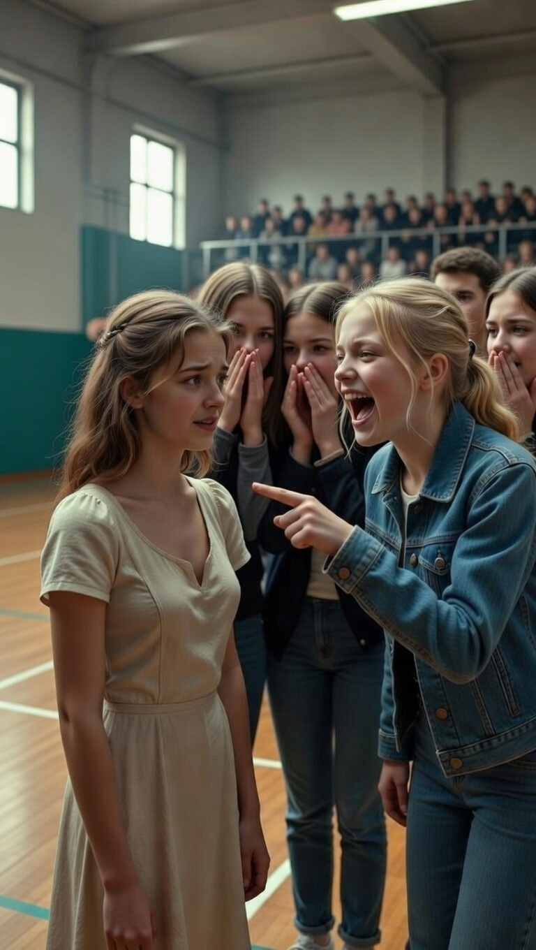 The gymnasium of Saint-Cyr High School rang with cruel noise. At the center of the worn wooden floor stood Éléna, frozen, arms crossed tightly over her beige dress, trying to vanish under the weight of hundreds of staring eyes. Facing her was Sarah, queen of the popular crowd, wearing a predator’s smile.