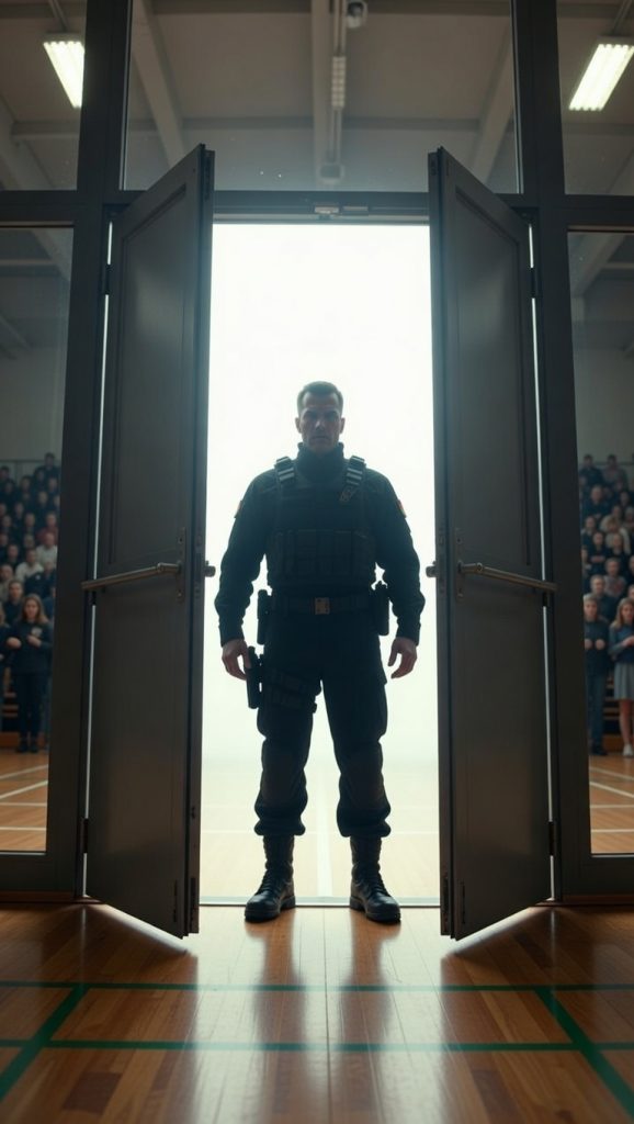 The heavy double doors at the far end of the gym slammed open with controlled violence. Harsh daylight flooded in, carving sharp silhouettes of three massive figures.
