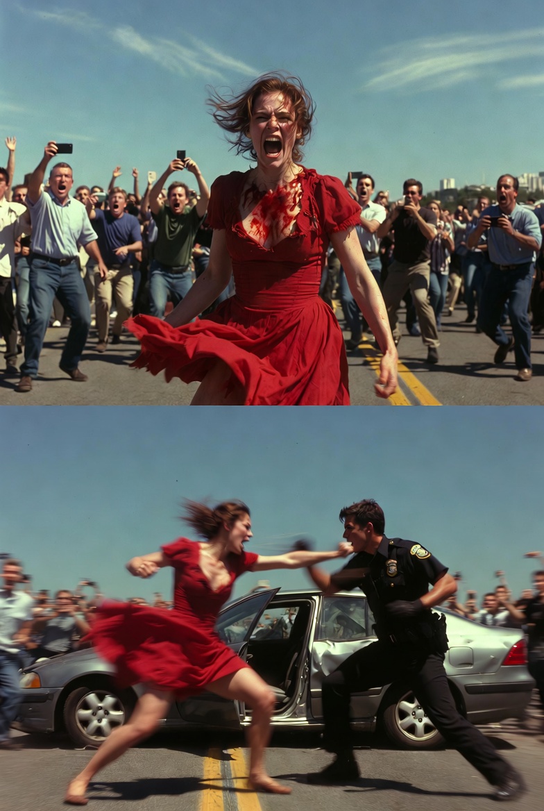 She kicked the door open and climbed out in the torn red dress she’d worn for the “date” that was supposed to keep her cover solid. Blood and engine oil stained the fabric. Phones were already up, filming.