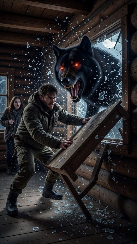 Liam moved before thought. He seized the heavy oak table—four centimeters thick, built by his grandfather—and rammed it against the shattered frame. The beast’s jaws snapped shut inches from his forearm; he felt the heat of its breath, smelled iron and wet fur. Muscles burning, he braced his shoulder against the tabletop while the animal thrashed, claws raking furrows in the wood.