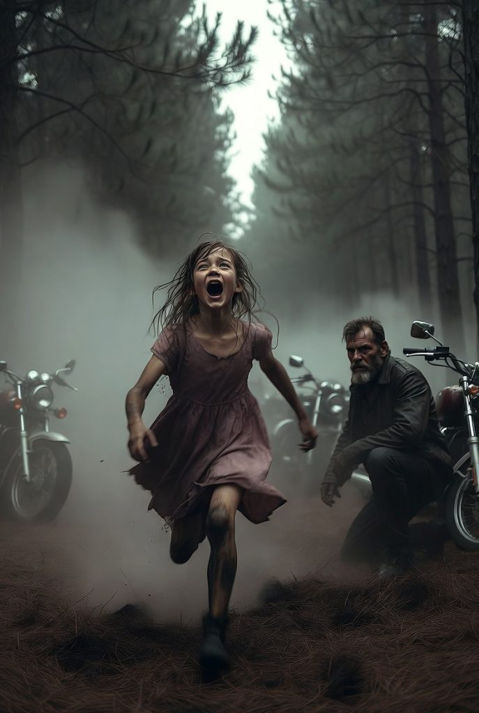 It lingered first on the foreground: the terrified girl in pink clinging to the kneeling biker, his massive frame curved protectively around her fragile one. Then it slowly panned away, drifting backward and deeper into the forest.