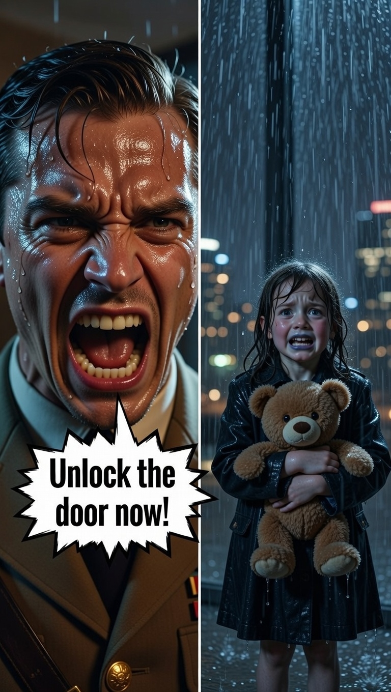 Suddenly, the front door swung open. Major Marcus stepped in, still clad in his dress uniform, medals glinting under the warm foyer lights. He expected a hero’s welcome, the warmth of a home rediscovered after months of deployment. Instead, his eyes fell first on Maria—and the cruel smile she couldn’t hide quickly enough—then on the window. His blood turned to ice. There, in the darkness of the terrace, his daughter was huddled against her teddy bear, her lips blue from the cold, pounding desperately against the glass.